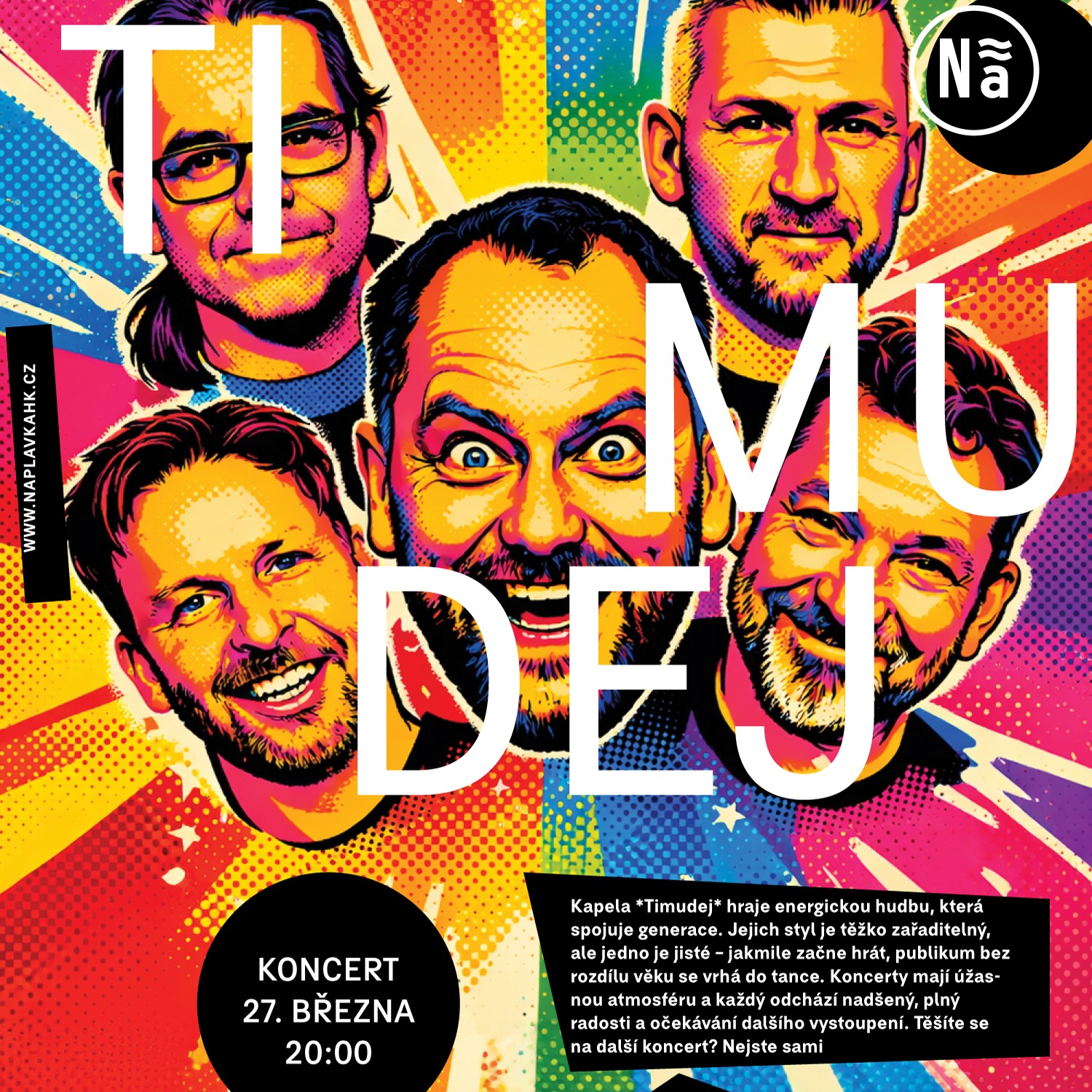 Kapela *Timudej* hraje energickou hudbu, která spojuje generace. Jejich styl je těžko zařaditelný, ale jedno je jisté – jakmile začne hrát, publikum bez rozdílu věku se vrhá do tance. Koncerty mají úž...