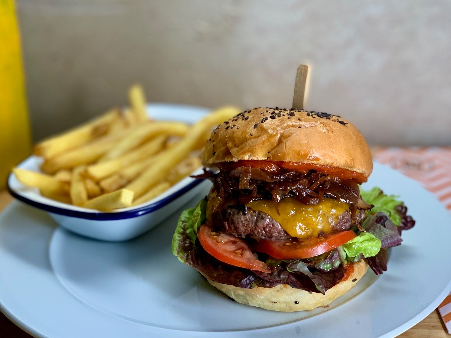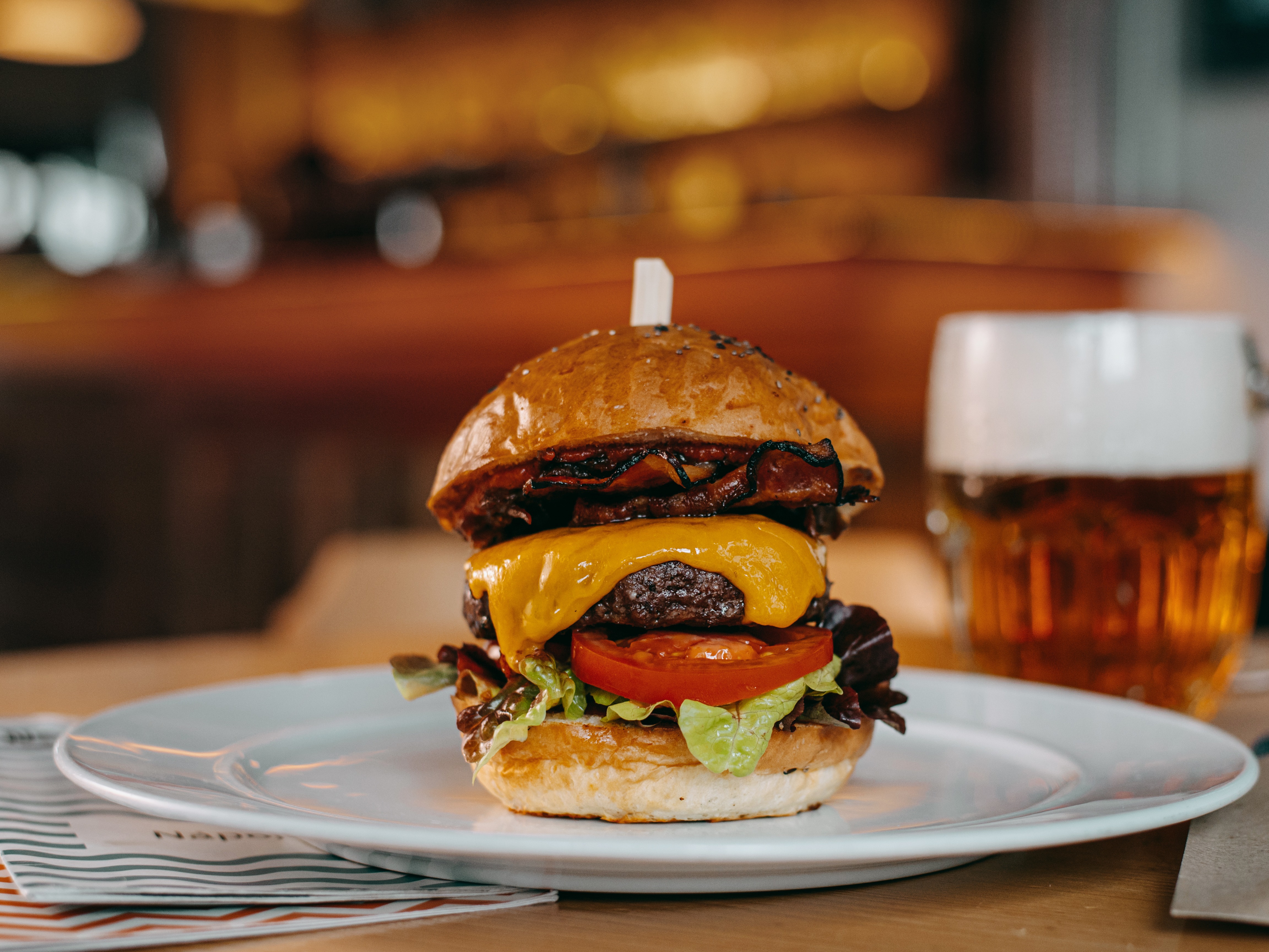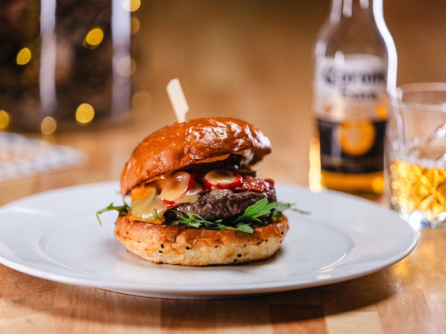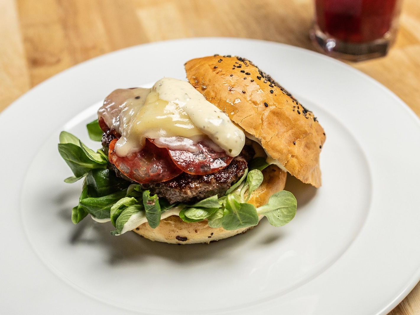 dvojité hovězí maso s raclette sýrem, grilovanou cibulí v černém pivu, BBQ omáčkou, cibulovými kroužky, majonézou, okurkovým pickles a polníčkem v Nãší sezamové bulce