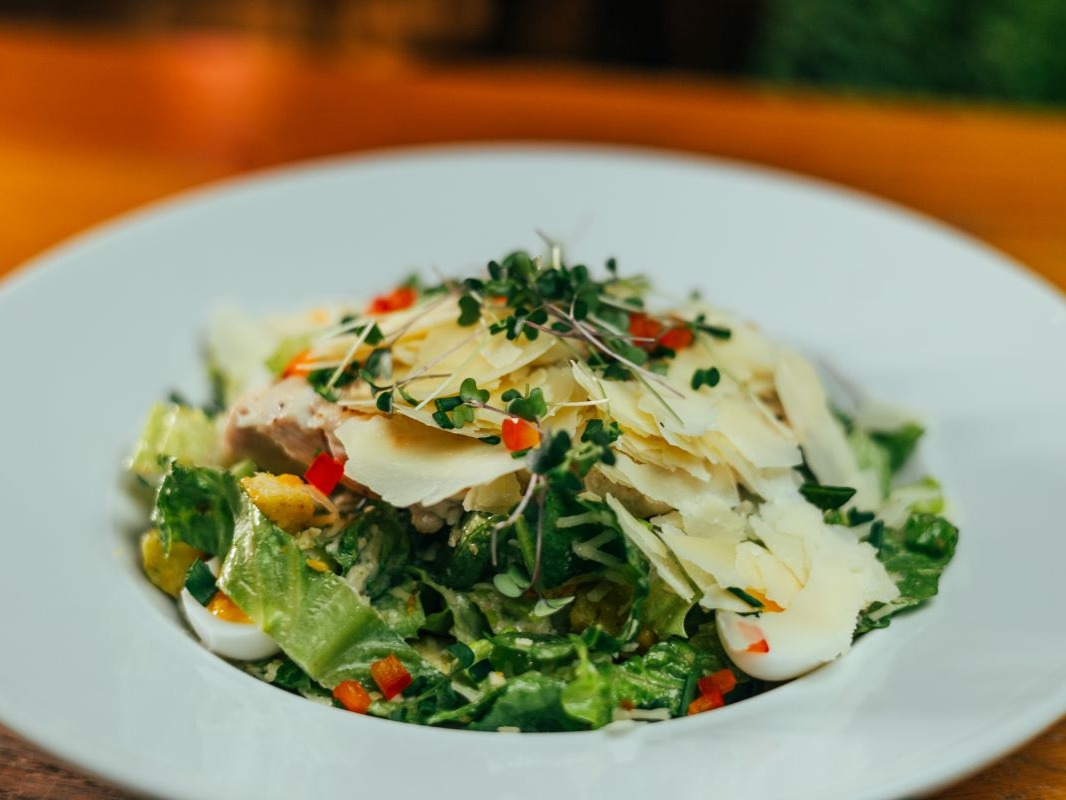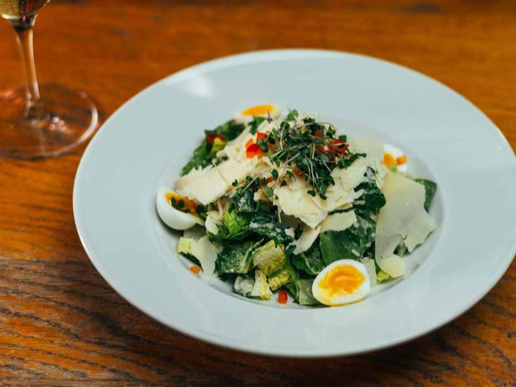listy římského salátu s rajčatovými krutóny, křepelčími vejci, hoblinkami sýru Gran moravia a caesar dresinkem