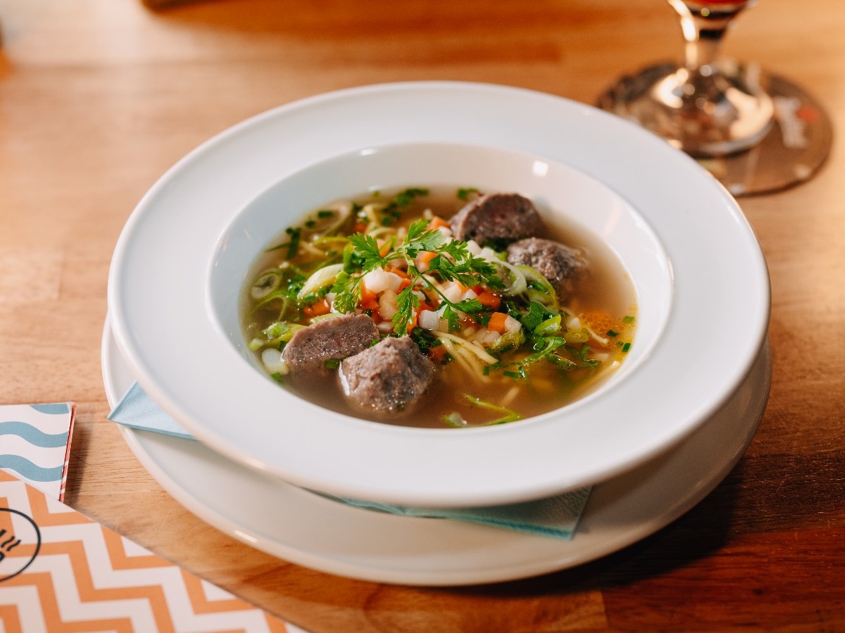 s játrovými knedlíčky, zeleninou a nudlemi