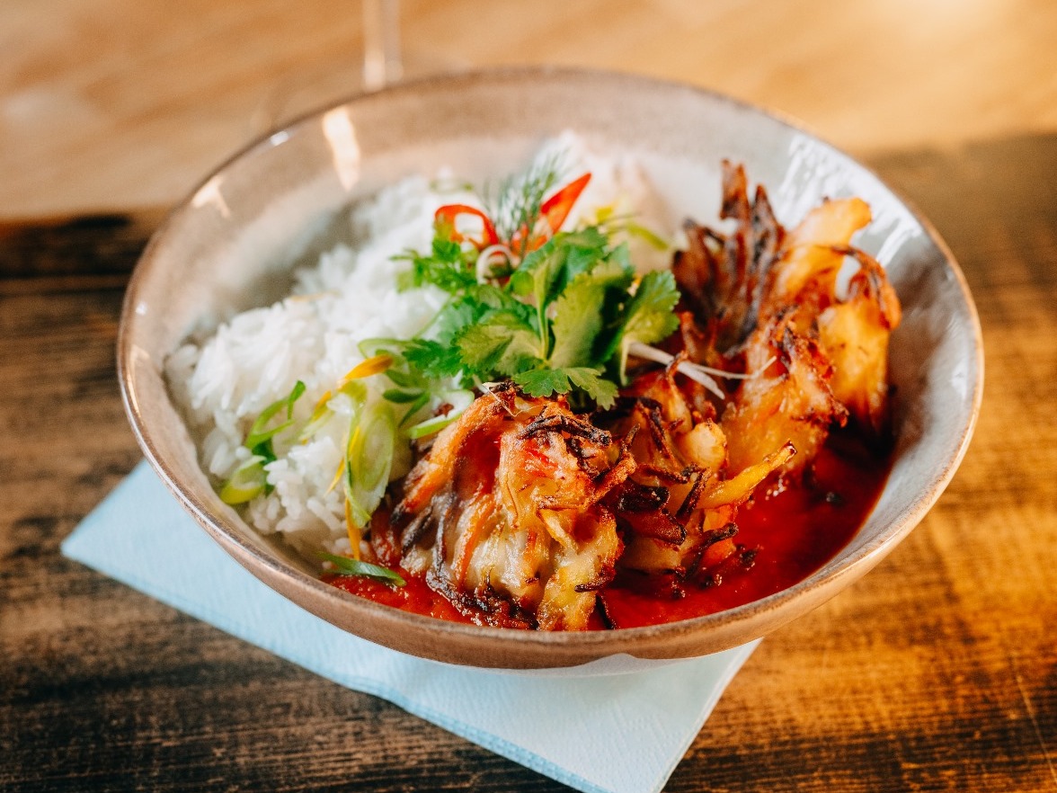 s rýžovými onigiri, pak choy, liči a omáčkou z červeného kari