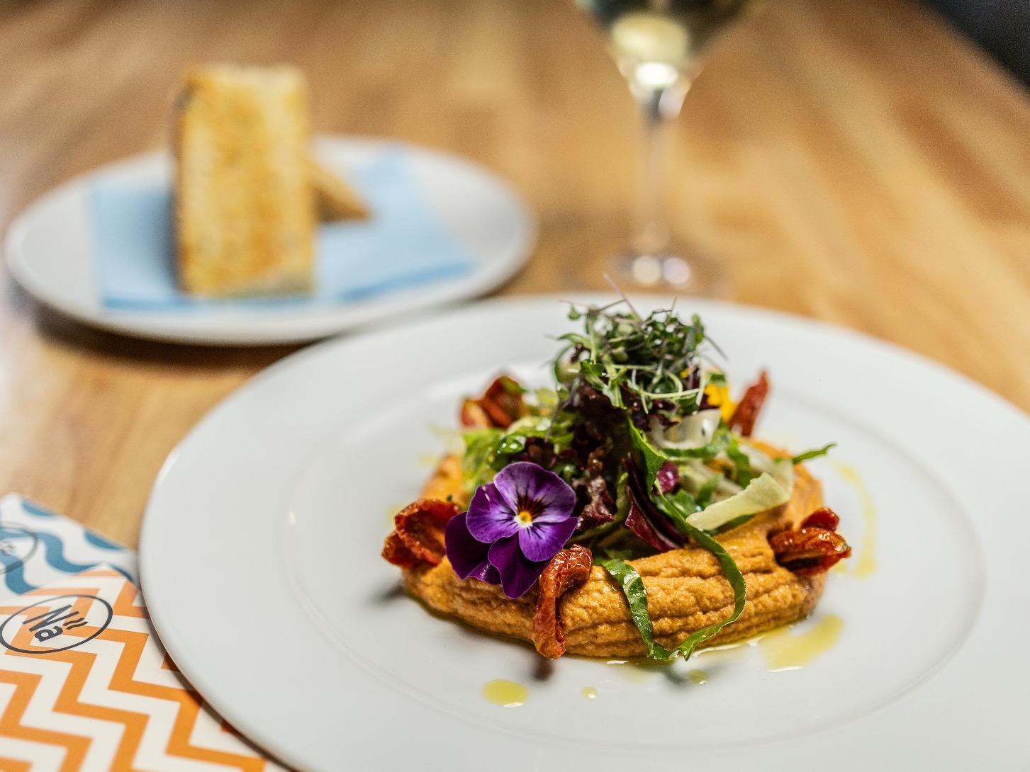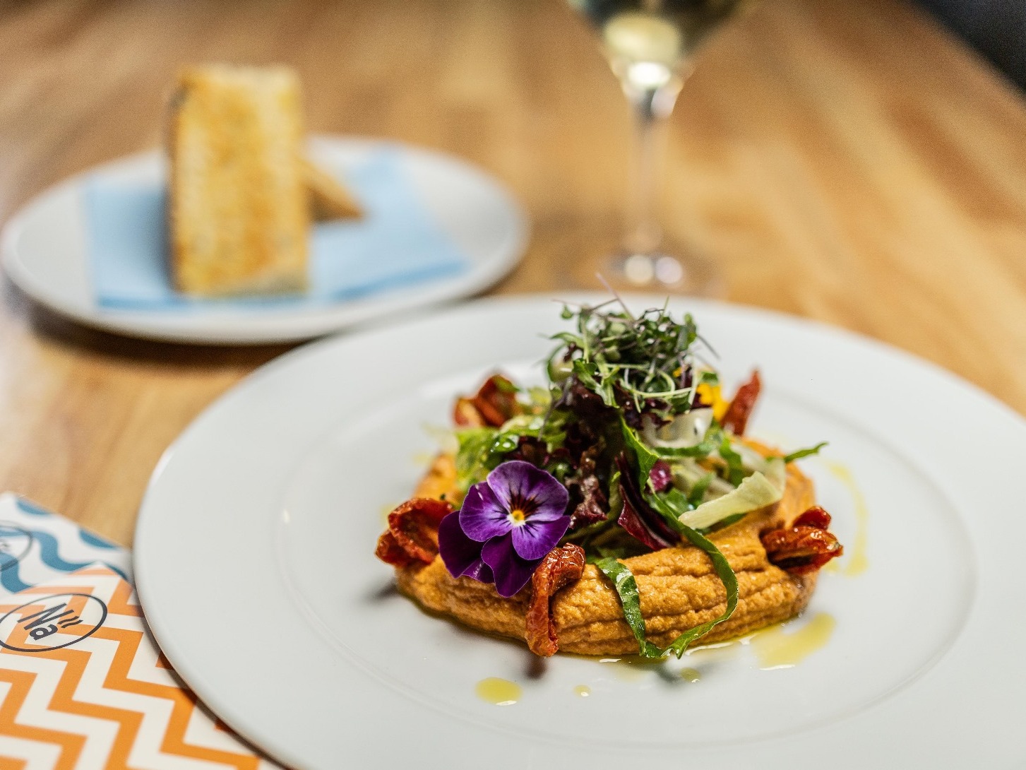 hummus ze sušených rajčat s grilovaným halloumi z mlékárny U Josefa, olivovým olejem, listovým salátkem, Nãšimi sušenými cherry rajčaty, microgreens a olivovou focacciou