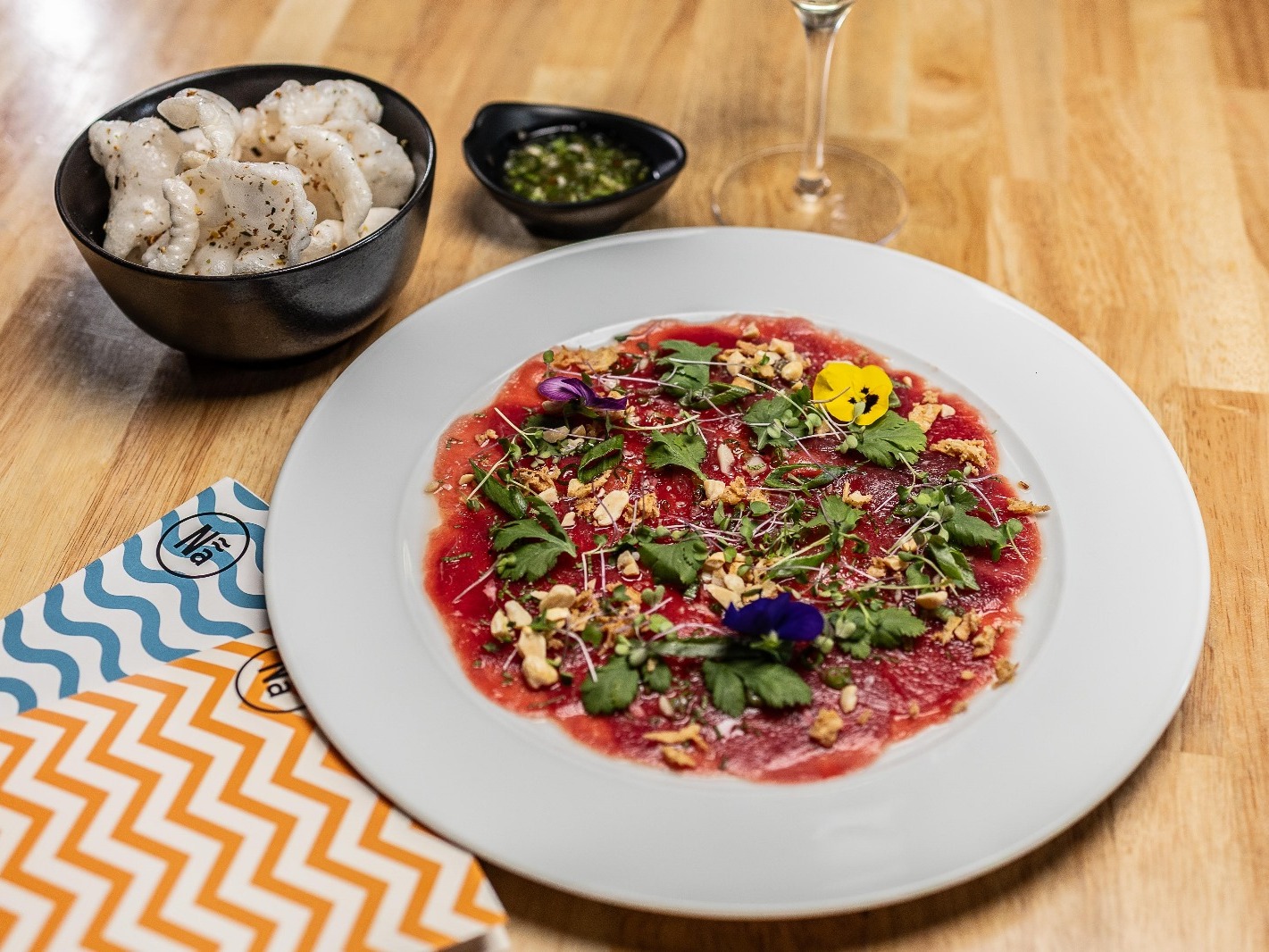 vietnamské "carpaccio" z hovězí roštěné s koriandrem, jarní cibulkou, Nước chấm omáčkou, smaženou cibulkou, Furikake, arašídy a krevetovými chipsy