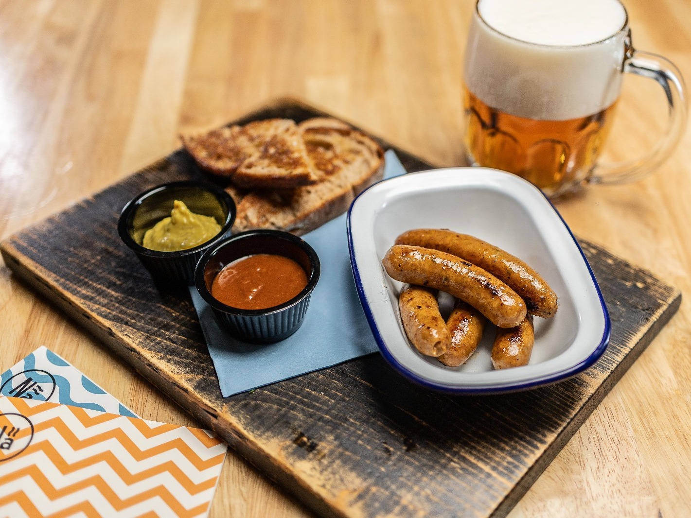 klobásky z Nãšeho smokeru s cheddarem a Jalapeños s BBQ omáčkou, křenovou hořčicí a chlebem od Optimisty