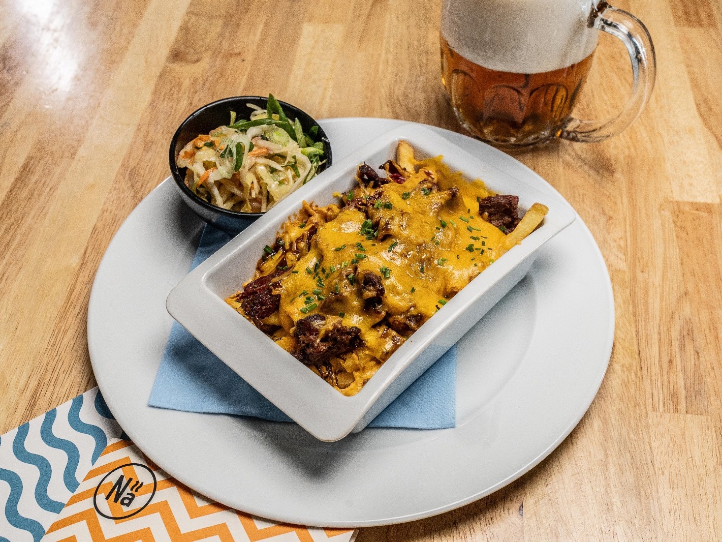 gratinované hranolky s trhaným Chuck rollem z Nãšeho smokeru, BBQ omáčkou, cheddarem a hořčičným Coleslawem