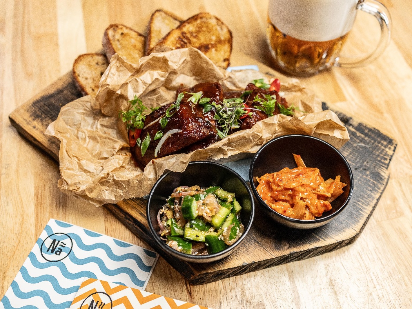 pečená vepřová žebra v korejské gochujang BBQ omáčce s kimchi, sezamovým okurkovým salátkem a chlebem od Optimisty