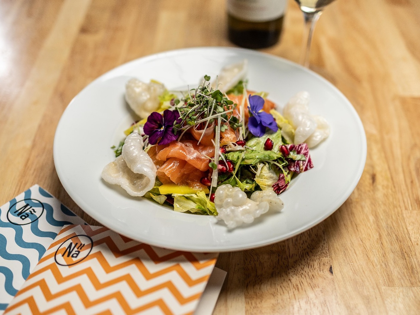 lososový gravlax na listovém salátu se žlutou ředkví Takuan, granátovým jablkem, Yuzu vinaigrettem a krevetovými chipsy