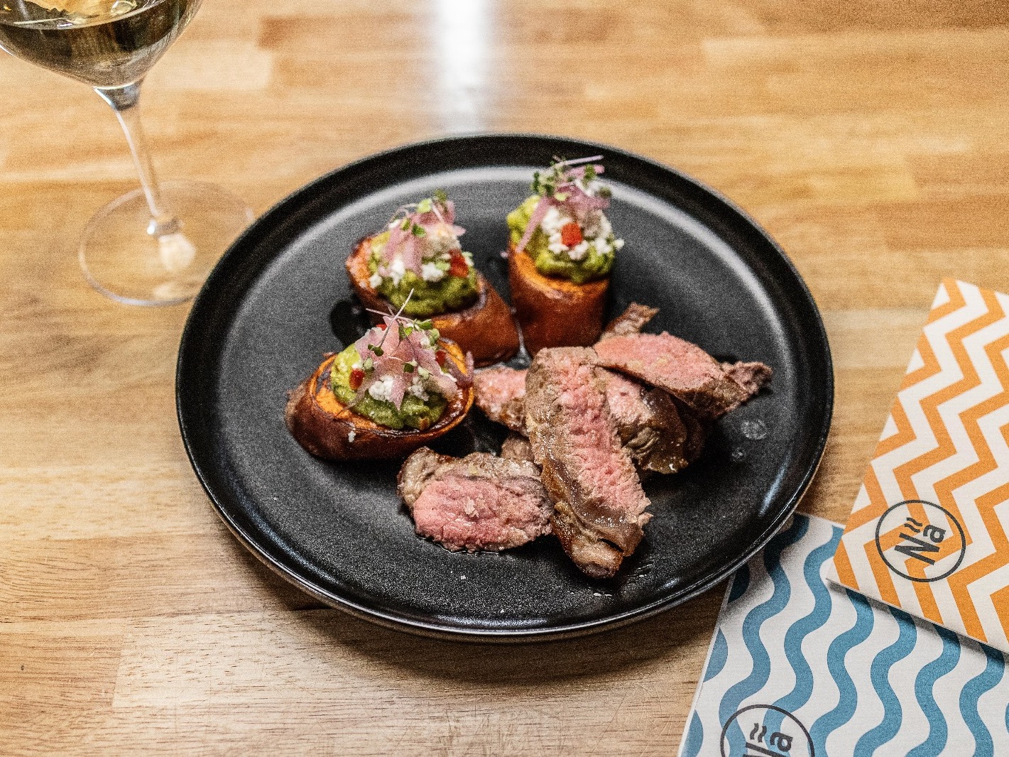 hovězí steak z vyzrálé roštěné s pečenými batáty, avokádovým guacamole a Fetta sýrem