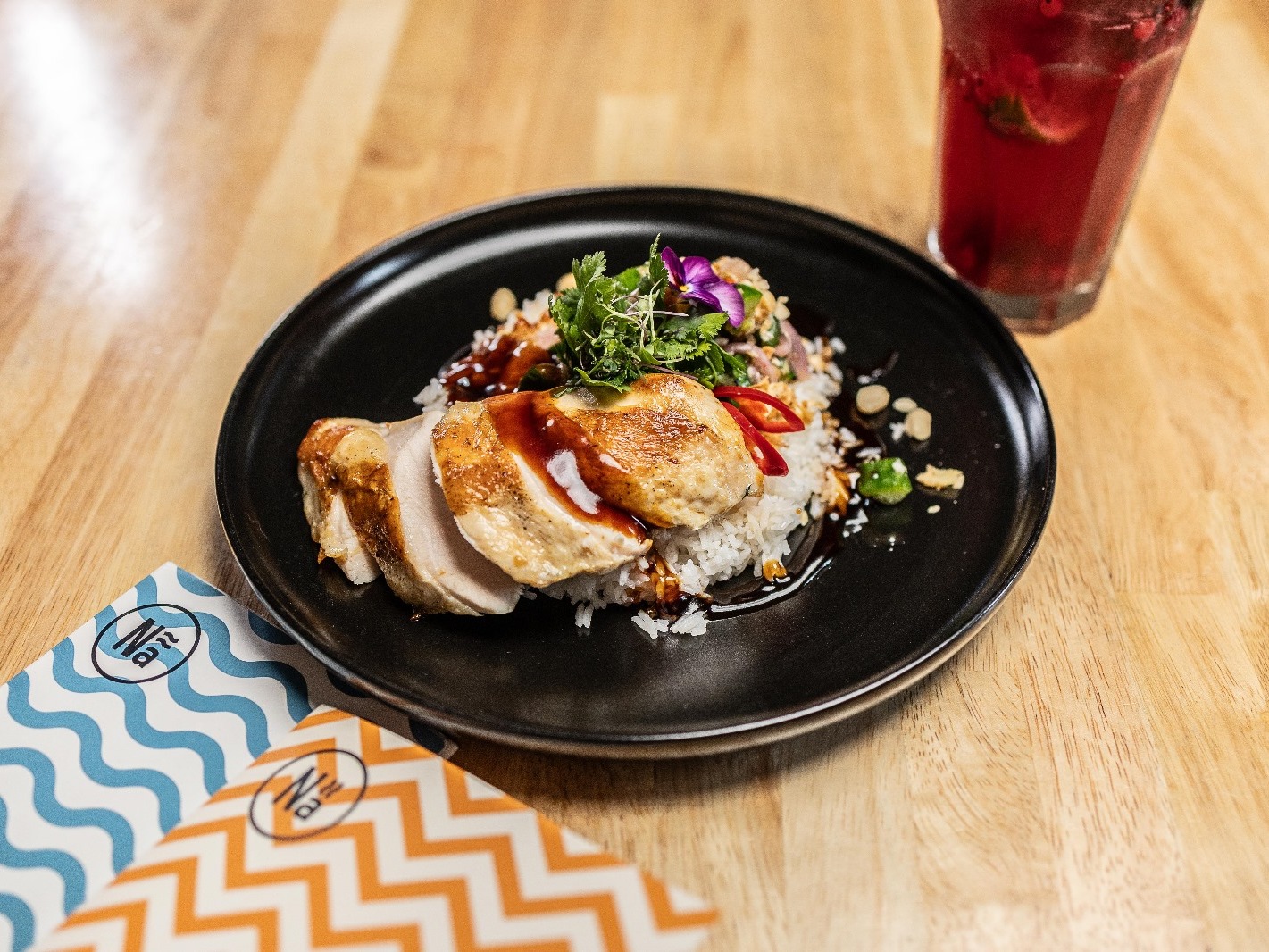 indonéské grilované kuře v pikantní marinádě s hoisin omáčkou, sladkokyselou zeleninou a koriandrem v Nãšem napařovaném bao knedlíku