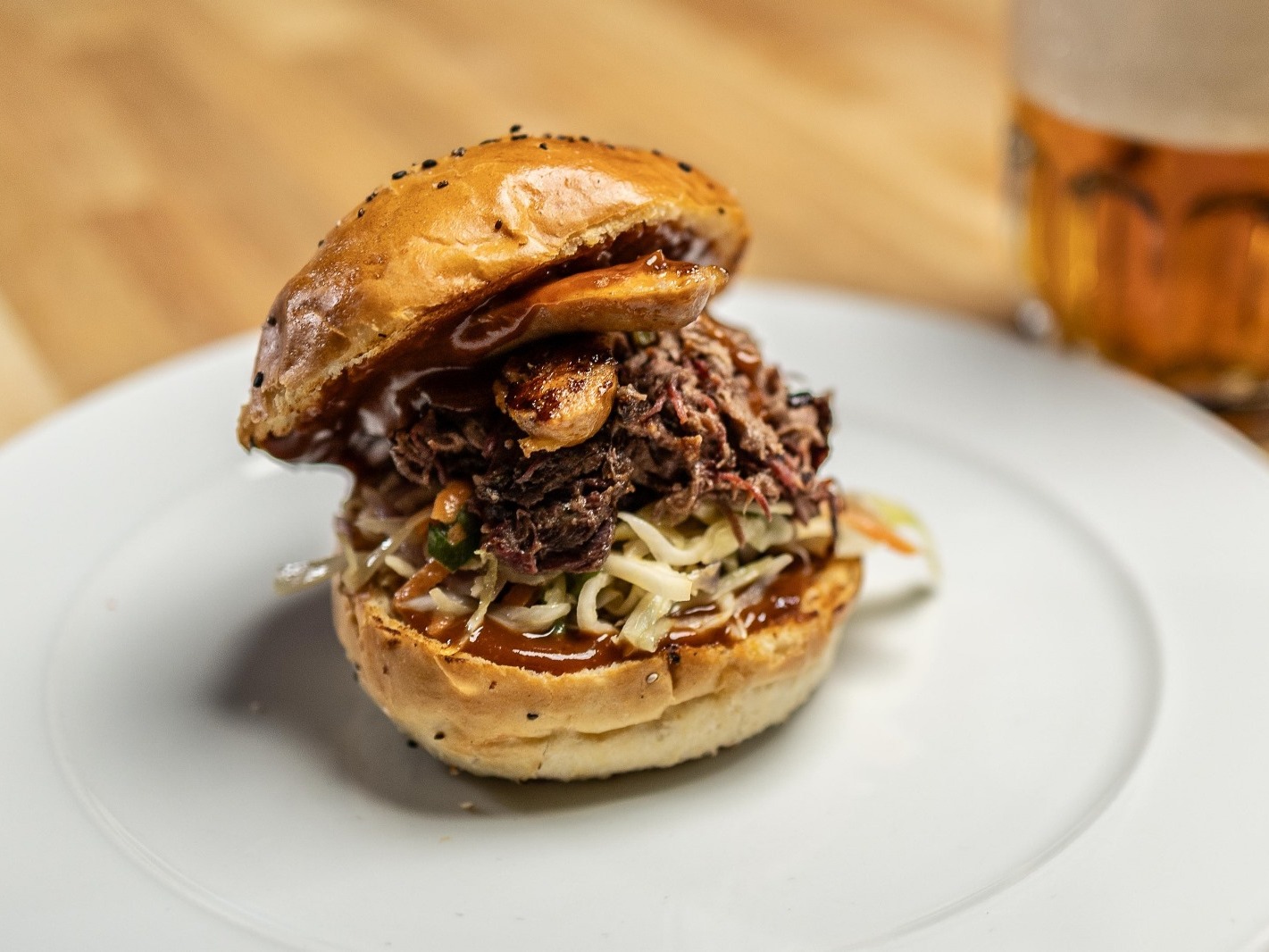 trhaný hovězí Chuck roll ze smokeru s Nãší klobáskou s cheddarem a Jalapeños, hořčičným Coleslawem a BBQ omáčkou v Nãší sezamové bulce