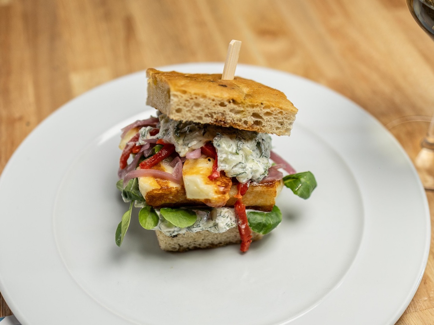 grilované halloumi z mlékárny U Josefa s okurkovými tzatziki, pečenou paprikou, microgreens, marinovanou červenou cibulí a polníčkem v Nãší olivové focaccie