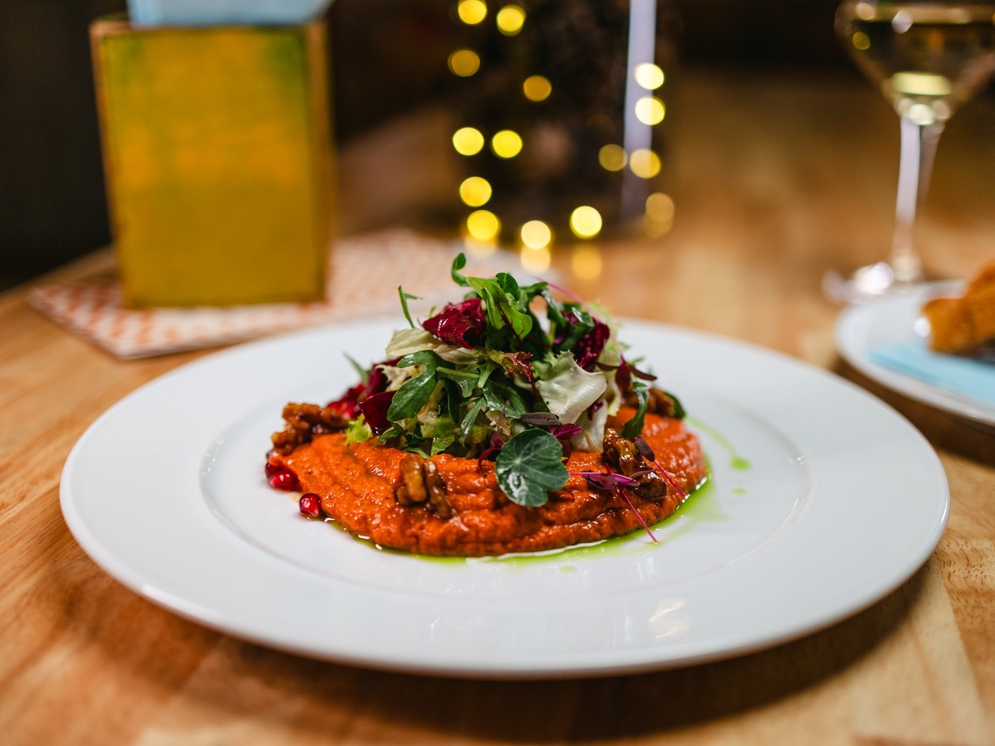 turecká pomazánka z grilovaných paprik s pečeným česnekem, vlašskými ořechy a granátovým jablkem s Nãší rajčatovou focacciou