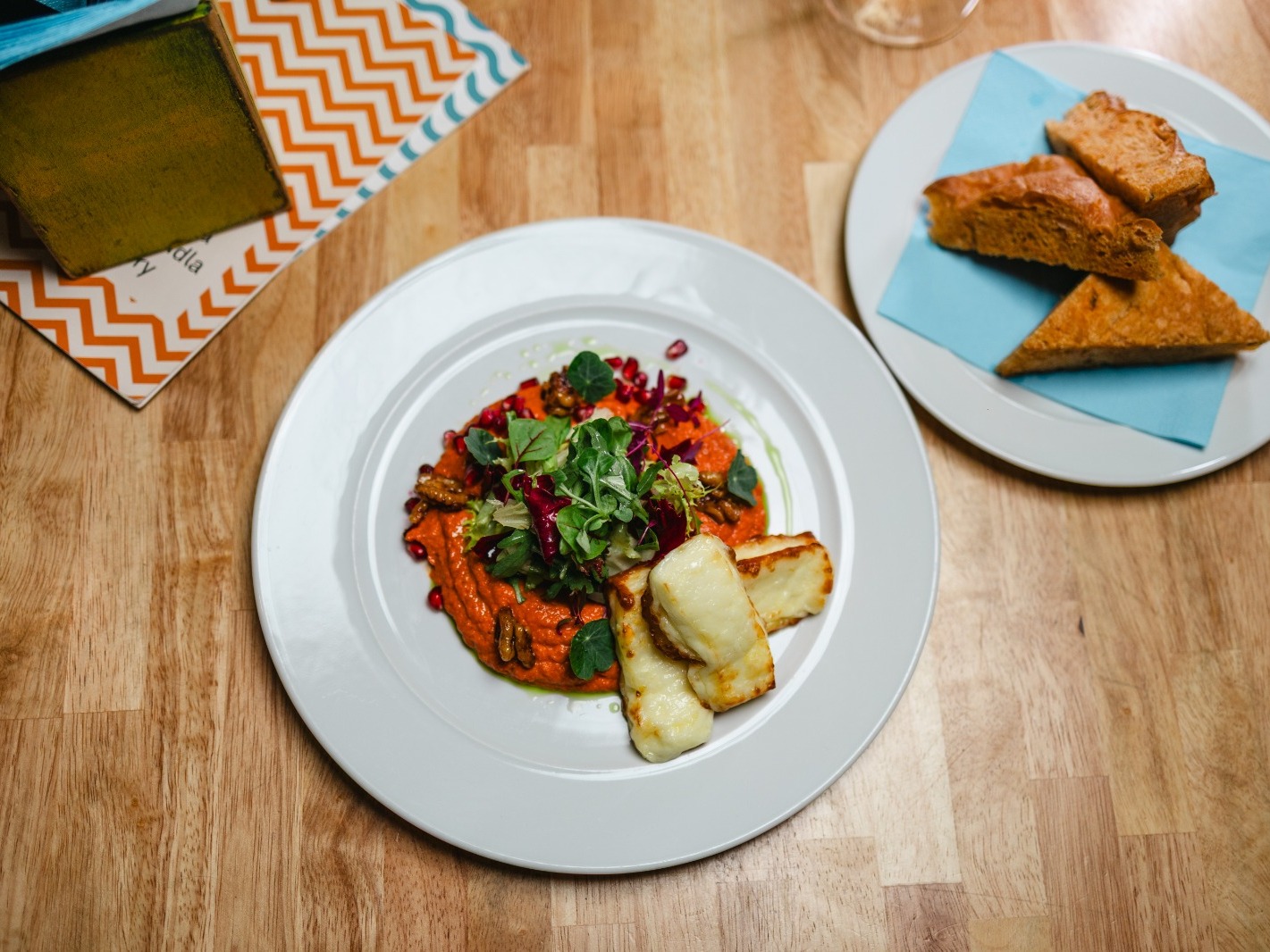 halloumi z mlékárny U Josefa s tureckou pomazánkou z grilovaných paprik s pečeným česnekem, vlašskými ořechy a granátovým jablkem s Nãší rajčatovou focacciou