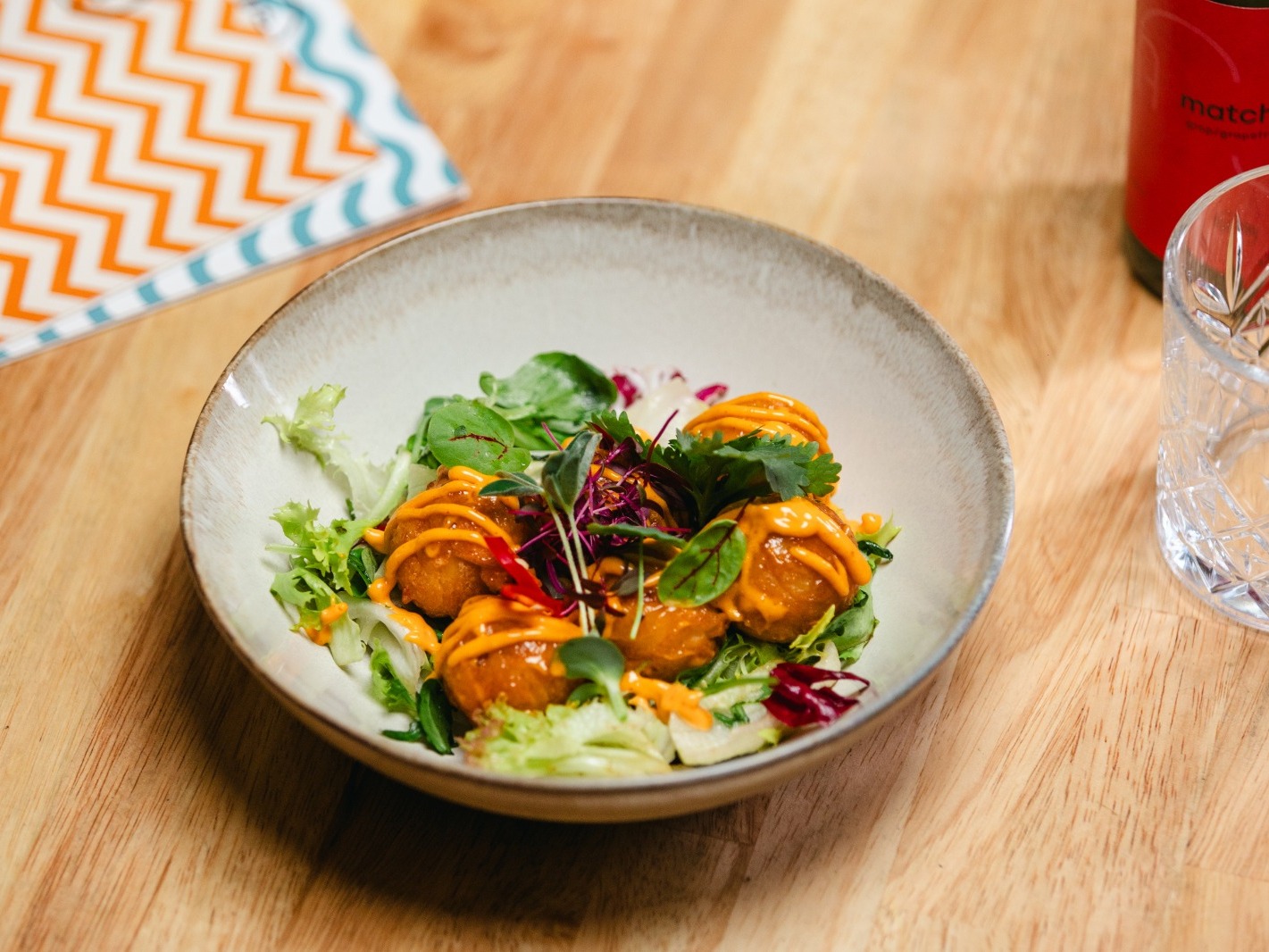 smažené japonské kuličky s krevetou, nakládaným zázvorem a jarní cibulkou s Yuzu mayo a malým listovým salátkem