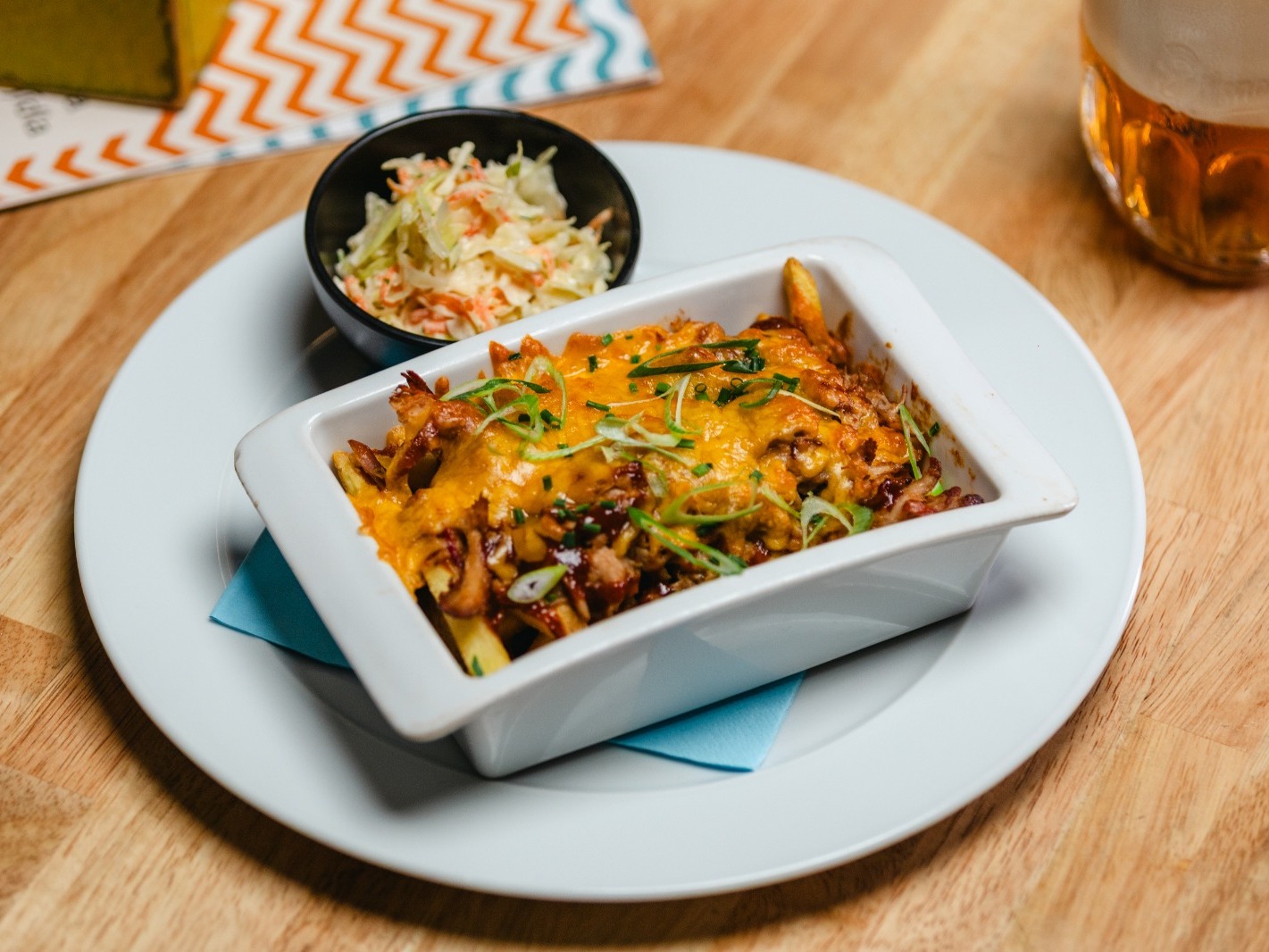 gratinované hranolky s trhaným vepřovým v char siu koření, BBQ omáčkou, cheddarem a Coleslaw salátkem
