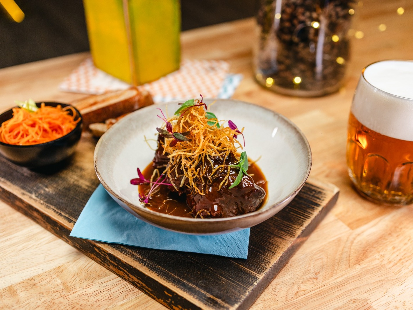 pomalu tažený hovězí karabáček se silnou hořčičnou omáčkou, korejskou česnekovou mrkví, bramborovou slámou a chlebem od Optimisty