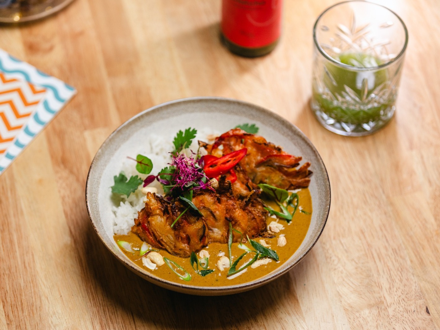 jemná omáčka ze zeleného kari s kešu ořechy, kokosovým mlékem, zeleninovou tempurou Kakiage, koriandrem a jasmínovou rýží