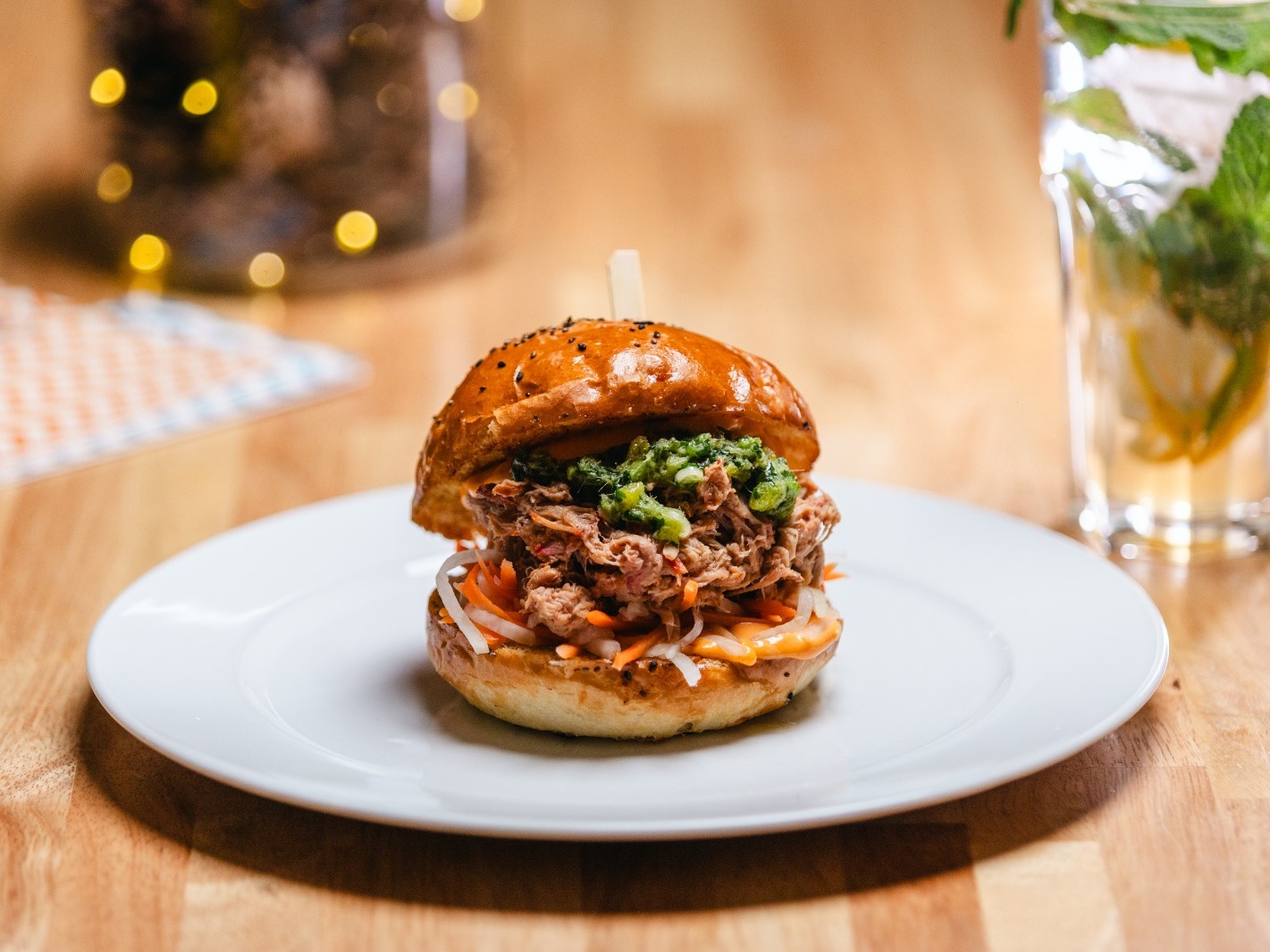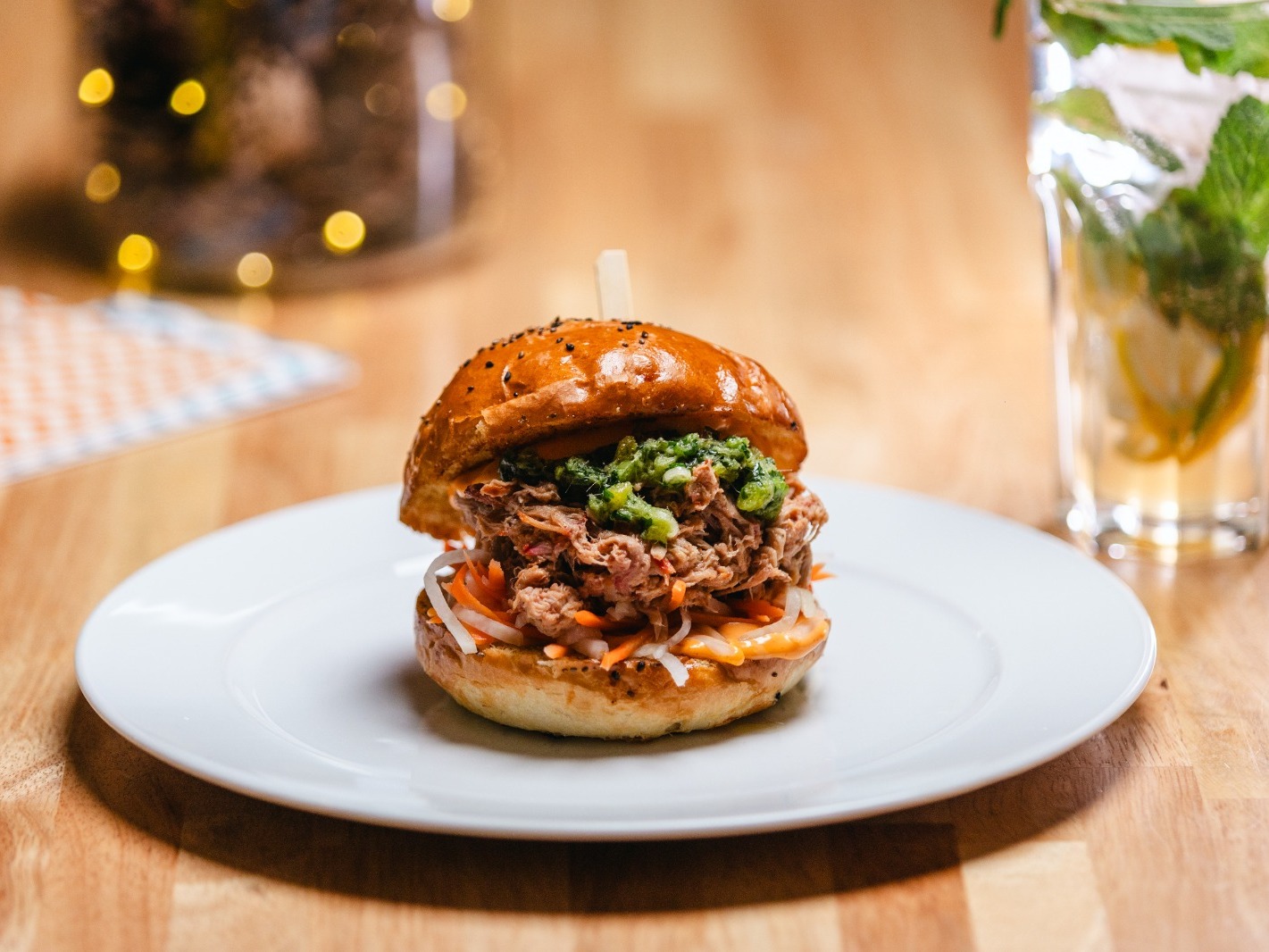 trhané vepřové v char siu BBQ koření, sladkokyselou zeleninou, vietnamským chimichurri a yuzu mayo v Nãší sezamové bulce