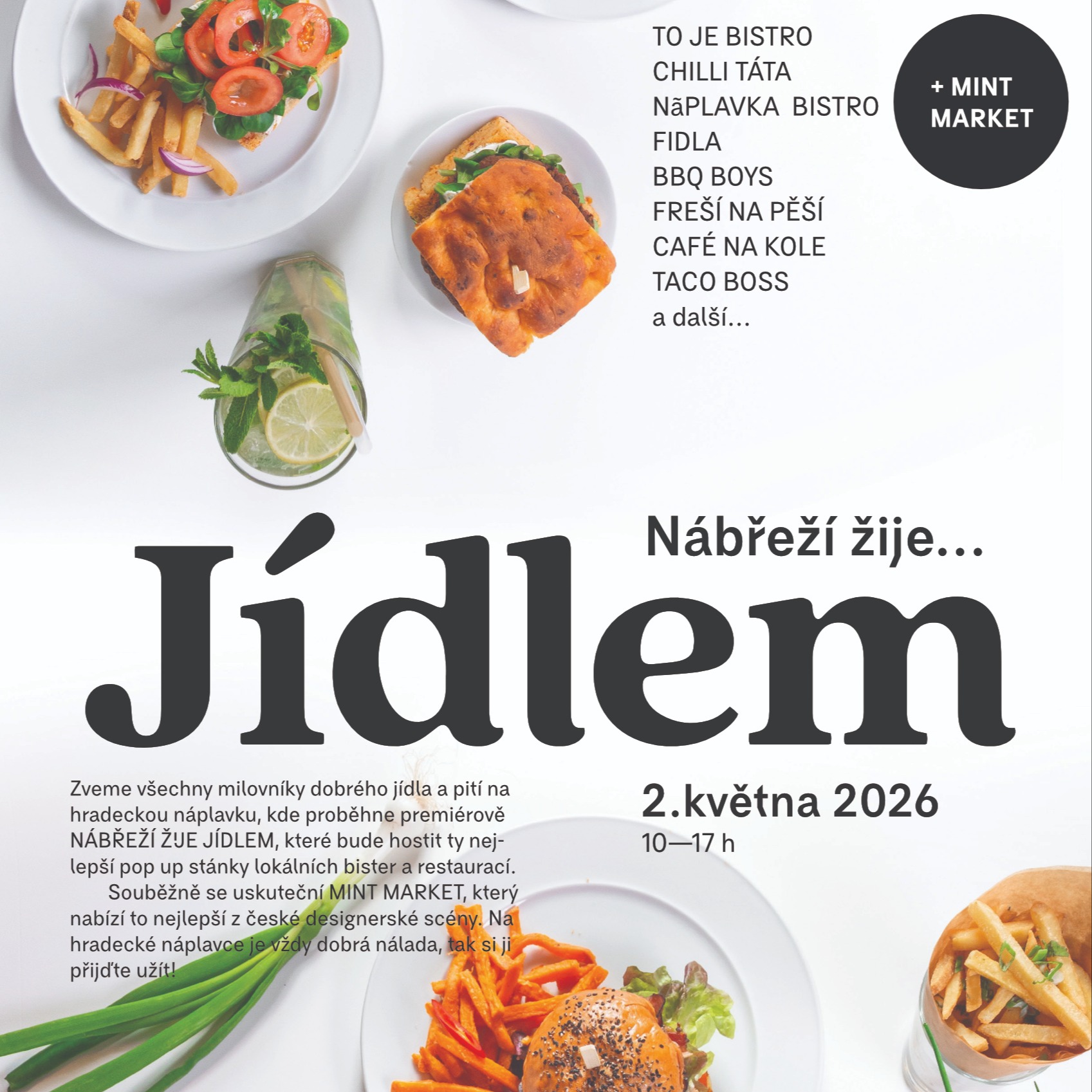 MINT Market Hradec Králové, trh se svěží módou, šperky a designem, se v neděli 26. dubna stane už počtvrté součástí oblíbeného Restaurant Day. Na Smetanově nábřeží tak bude moci kromě vynikajícího jídla, lahodných drinků a koncertů najít i přehlídku toho nejlepšího z české designérské scény.