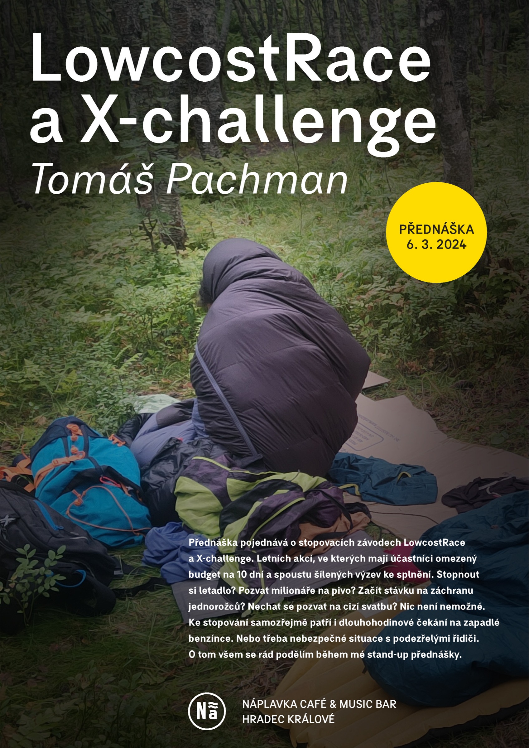 Přednáška pojednává o stopovacích závodech LowcostRace a X-challenge. Letních akcí, ve kterých mají účastníci omezený budget na 10 dní a spoustu šílených výzev ke splnění. Stopnout si letadlo? Pozvat milionáře na pivo? Začít stávku na záchranu jednorožců? Nechat se pozvat na cizí svatbu? Nic není nemožné.