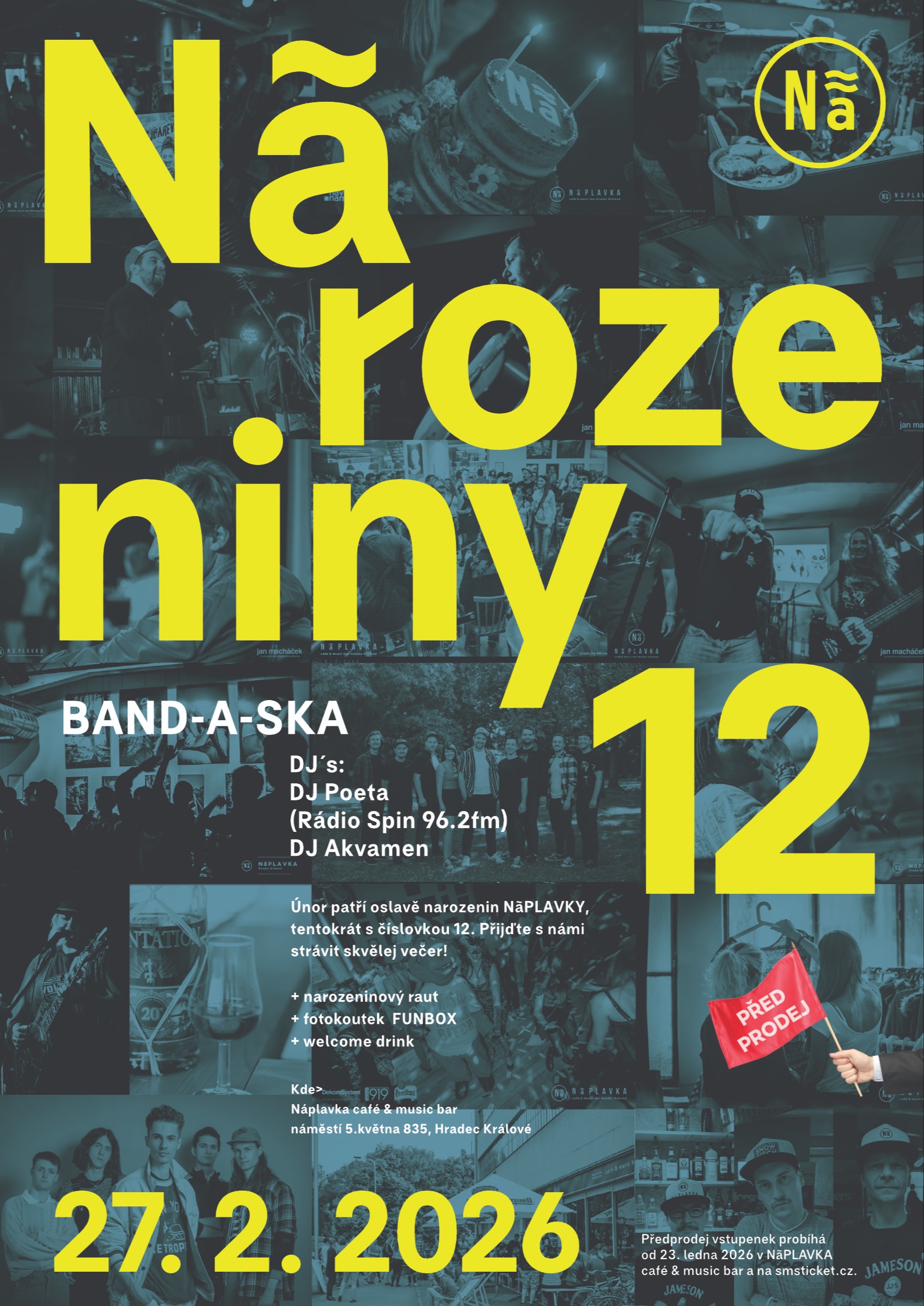 Únor patří oslavě narozenin NãPLAVKY, tentokrát s krásným číslem 12. Přijďte s námi strávit skvělej večer! NãPLAVKA slaví narozeniny a je jisté, že to bude velké! Vystoupí východočeši BAND-A-SKA. Roztancují Vás legendární DJ´s Akvamen a Poeta, čeká Vás videoprojekce, narozeninový raut, fotokoutek a welcome drink. Na téhle VIP party nemůžete chybět!