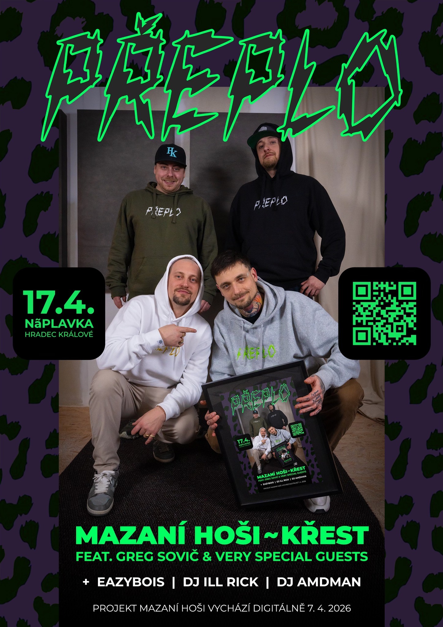 Přeplo a Greg Sovič křtí nový společný projekt Mazaní Hoši (vychází 7. 4. 2026), a to v doposud nejdelším Přeplo setu za účasti vzácných hostů! Jako support vystoupí Eazybois, kteří posledně v Nã zahráli skvělý koncert. Plus našlápnuté sety od DJ Ill Rick a DJ Amdman. Slyšíme a vidíme se v NãPLAVCE 🔜 v pátek 17. 4. 2026!